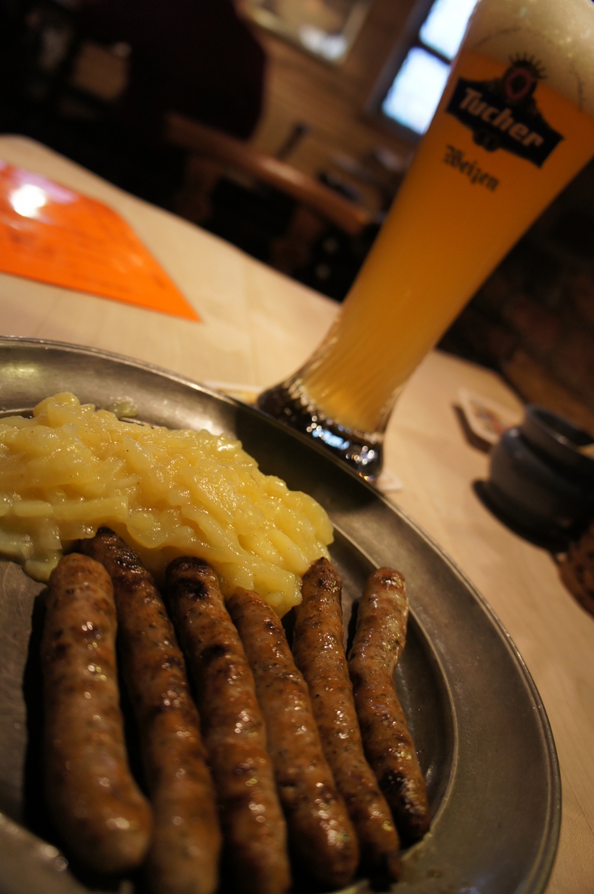 炭火焼の、ドイツ一といわれるというニュルンベルガーソーセージの焼き立てを食べられます。