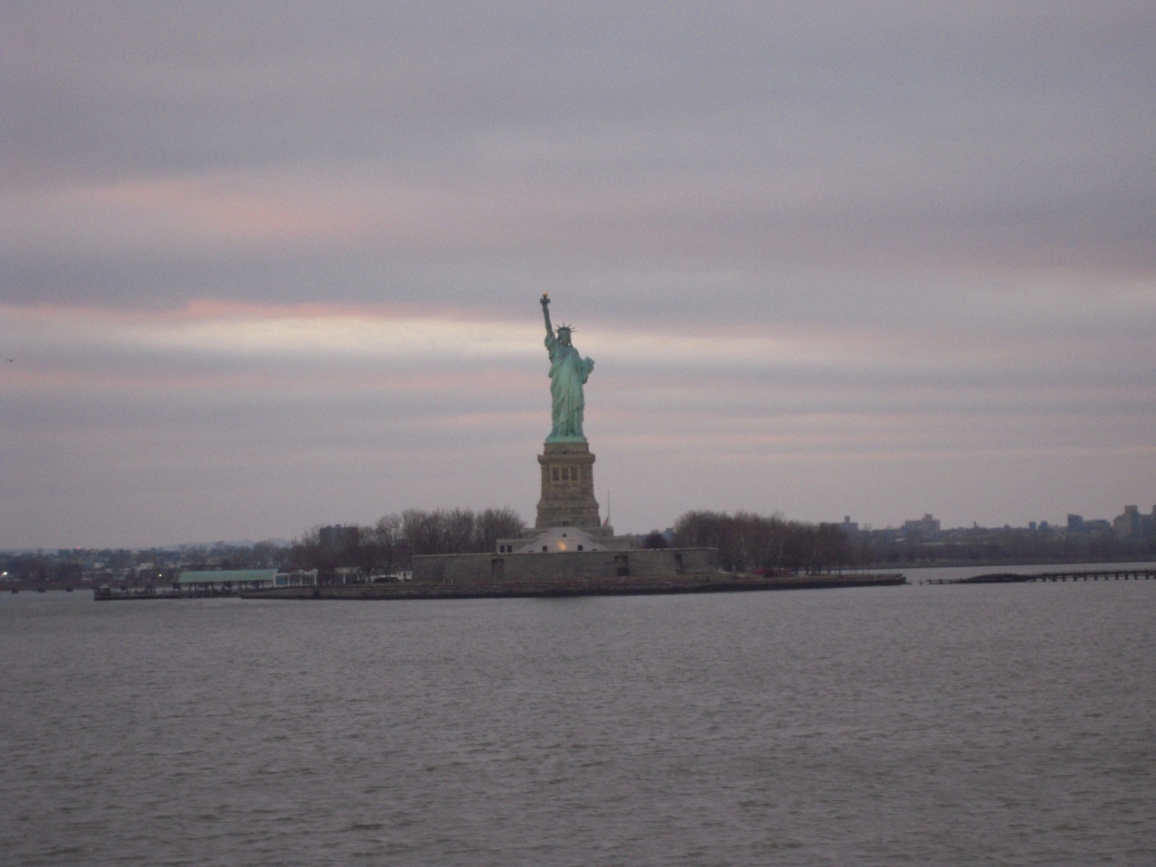 スタテン島行きのフェリー(無料)の右舷から見えます。アッパーデッキでも見れますが、通常階の右舷からでも見えます。
