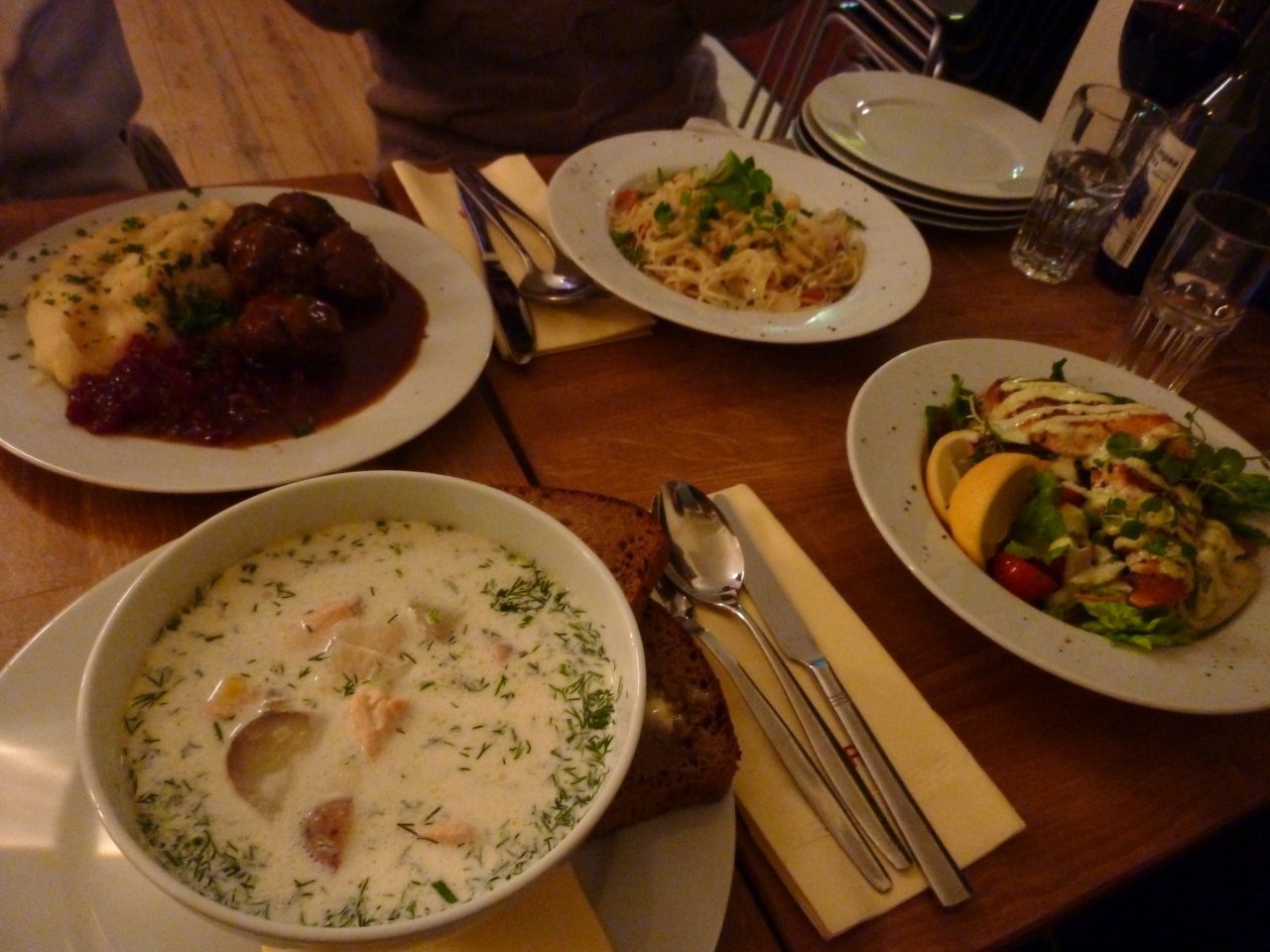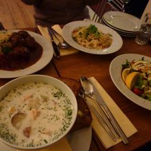 注文したのは、サーモンスープ、ミートボール、エビのパスタなど。どれも味にクセもなく食べやすkったです。