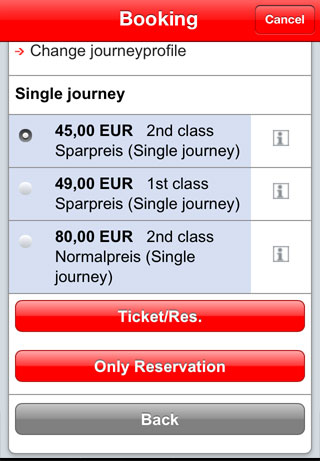 ドイチェ・バーンのサイトにユーザー登録している人であれば、アプリをダウンロードして設定するだけで使えるようになります。ホテルなどのWIFI環境でネット接続し、検索・購入できますので、パケット通信を使う必要がないのもよいところです。