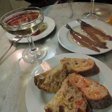 ピカソ美術館の通りにある有名バル。お店の人はとても親切でした。アンチョビ、ドライトマト、バカラオ、イワシの酢づけ、パプリカのクリームチーズづめとパンを頼んで、おすすめのお店オリジナルのシャンパニエットをいただきました。甘口で、アルコールも低そうでしたが、しっかりと冷えていておいしかったし、アンチョビとドライトマトは秀逸です。連れはこのお店のつまみをとても気に入ってました。お店の人がとにかく親切なので、素敵な時間を過ごせました。