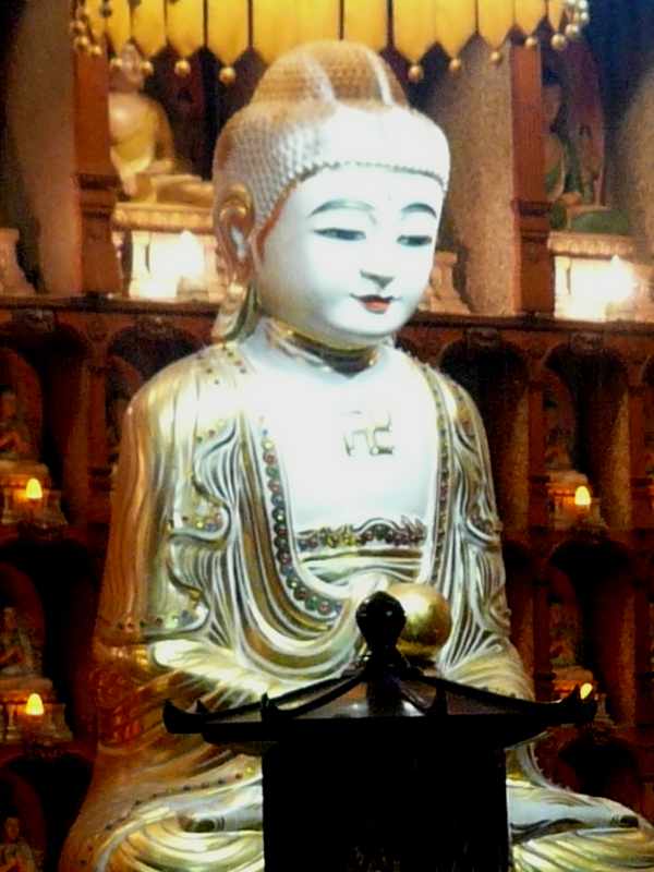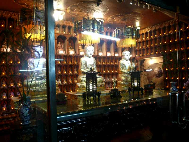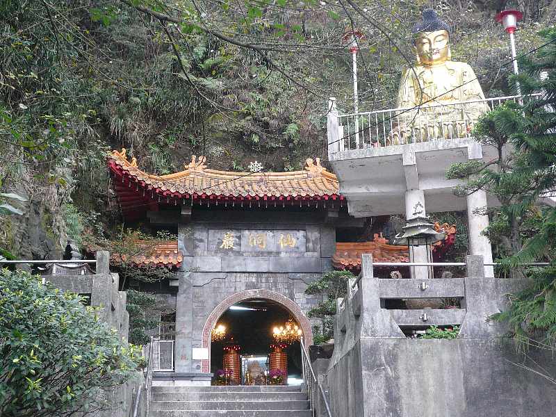 行き方は、基隆駅前ロータリーのバス停(改札口を背にして左手方向)から市バス301番「太白荘」行きに乗り、約20分乗って「仙洞巖」で降ります。降りたバス停から駅へ戻る方向へバス道を10mも歩けば、山手方向に寺院の門が見えます。洞窟入口の右上には金ピカの大仏様が鎮座しておられます。大仏の横には寺院の事務棟があり、洞窟内には管理人らしき人がいて、私が参観している間にも、地元の人らしき参拝者が何人もやって来たので、単なる洞窟ではなくて現役のお寺として地元に根付いているようです。なお拝観は無料でした。