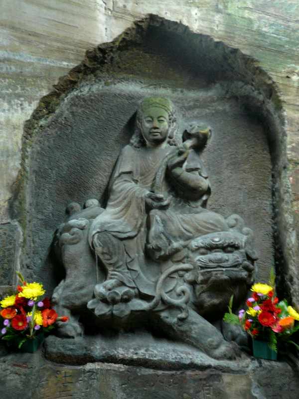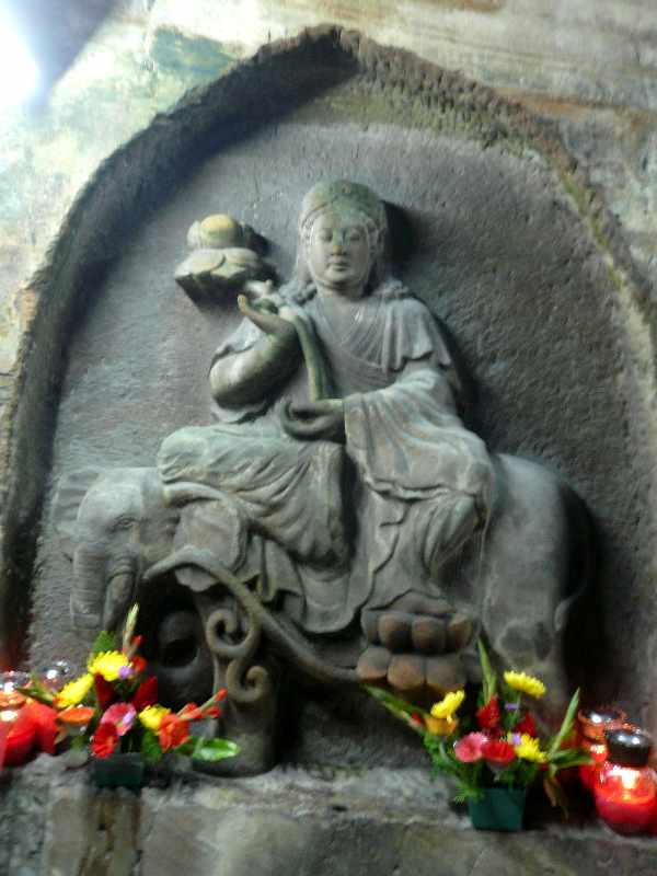 入口の大仏といい奥の本尊といい私の芸術的価値観とは相容れませんが、地元の信者の方々は芸術的価値の為に仏像を設置している訳ではないでしょうから、よそ者がとやかく言う筋合いは有りません。しかしながら、洞窟の壁面のレリーフは、いろいろな年代にいろいろな人が彫ったようで、そこそこ古い時代に素人が彫ったらしい古拙な仏像や、本職の彫刻家が彫ったと思える端正な仏像が混在しており、興味深く拝見しました。文殊、普賢両菩薩像は少々西域の香りを感じます。近年のプロの彫刻家の手による作品でしょう。
