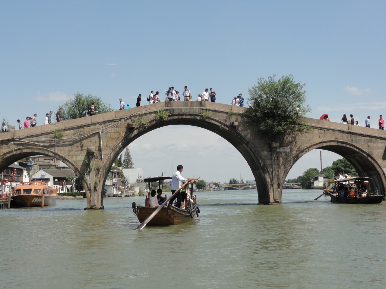 放生橋は上海からバスで1時間ほど行った水郷集落の朱家角にある大きな橋です。440年前に建設された高さ7メートルのアーチ型の石橋で、上に登ると水郷集落に広がる川がよく見渡せます。金魚を放すと幸運が来るそうで金魚を売る屋台がありましたが、あまり買う人はいませんでした。