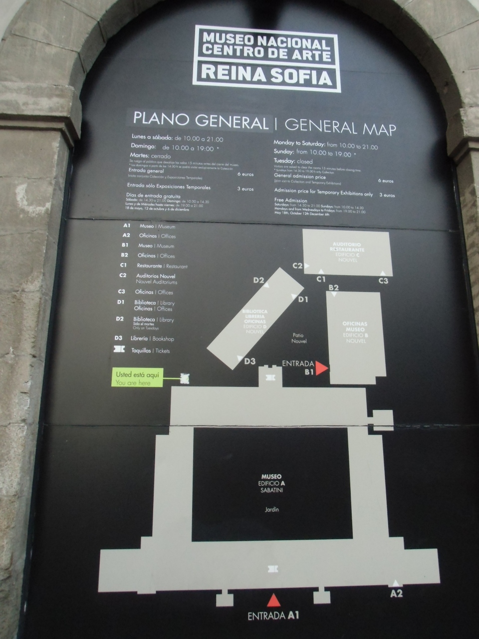 プラド美術館からプラド通りを南へ10分ほど歩くとソフィア王妃芸術センターに着きました。時間が19時半と遅かったので、無料で入れました。19時以降に無料で入場する場合、チケット売り場で無料のチケットをもらって中へ入ります。この美術館は2階と4階が常設展で3階が企画展になっていました。無料チケットでは常設展のみ入ることができます。写真撮影は禁止です。ピカソのゲルニカは2階にあり、警備員さんに厳重に警備されていました。作品は想像していたよりも大きな作品で、とても迫力があり、とても感動しました。その他にも、ダリ、ミロ、タビエスなどの作品があるので、現代美術が好きな方は時間をかけてゆっくり鑑賞されると良いと思います。大きな美術館ですので、どんな作品が展示されているか、入場無料の時間を利用して下見できるのがとても良いと思いました。ちなみに私はゲルニカを鑑賞できたので、これで十分でした。