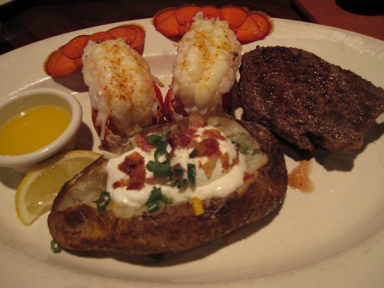 料理はロブスターを食べたかったので、写真のSteak+Lobster Dinner 46.99ドルとRipper Shrimp 13.99を頼みました。料理は2人でシェアして十分と感じました。サラダもついていましたが、日本の2人前くらいの量でした。サーロインは赤身を味わうという感じでおいしかったです。なぜか焼き加減を聞かれなかった肉はすこし焼きすぎという気がしたのが残念ですが。ロブスターもエビもおいしかったです。ビールはミラーを飲みましたが、私はバドより好きですね。