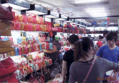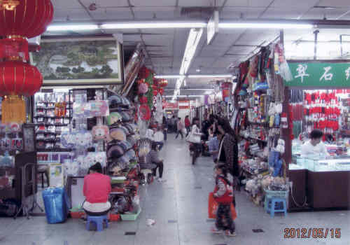 地下鉄「豫園」駅3号出口を出てすぐの所にある福佑門商厦の中に福佑門小商品市場があります。中に入ると碁盤の目のような通路に一坪ショップが並ぶ。一階の店舗図面を見ると、店舗番号がビル内が328店舗、道路に面した店の東西南北の番号を足すと400店舗近くなります。上層階は1店舗当たりの面積が増えて200店舗、5階建てとして1200軒はあるのではと思われます。とても数え切れません。扱っている物はアクセサリーや婦人雑貨、バッグなど男物のカバンも少しあります。同じ様な物を扱う店が多いので何軒か見て値段の目安を付けて値切りましょう。数を買うなら更に値切りましょう。