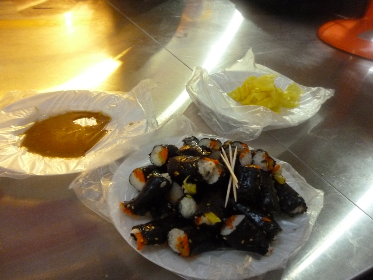 席に着くやいなや、早速キンパッが運ばれてきました。スープな様な物も一緒に出てきます。たれにつけて食べるのですが、これがまた絶品!!まさに麻薬キンパッ!!でした。お持ち帰り専用の列もあったので今度お持ち帰りして食べたいと思います。