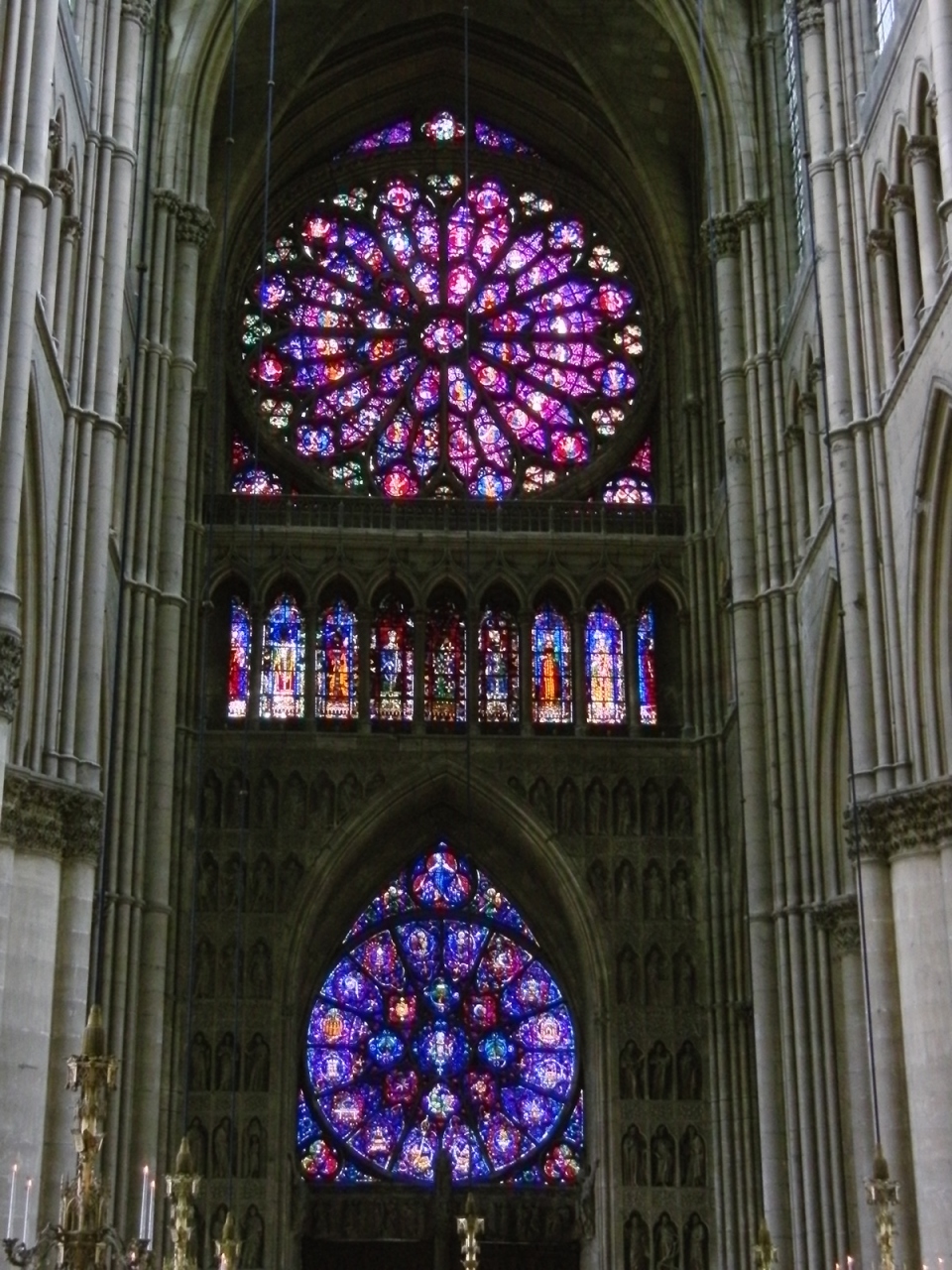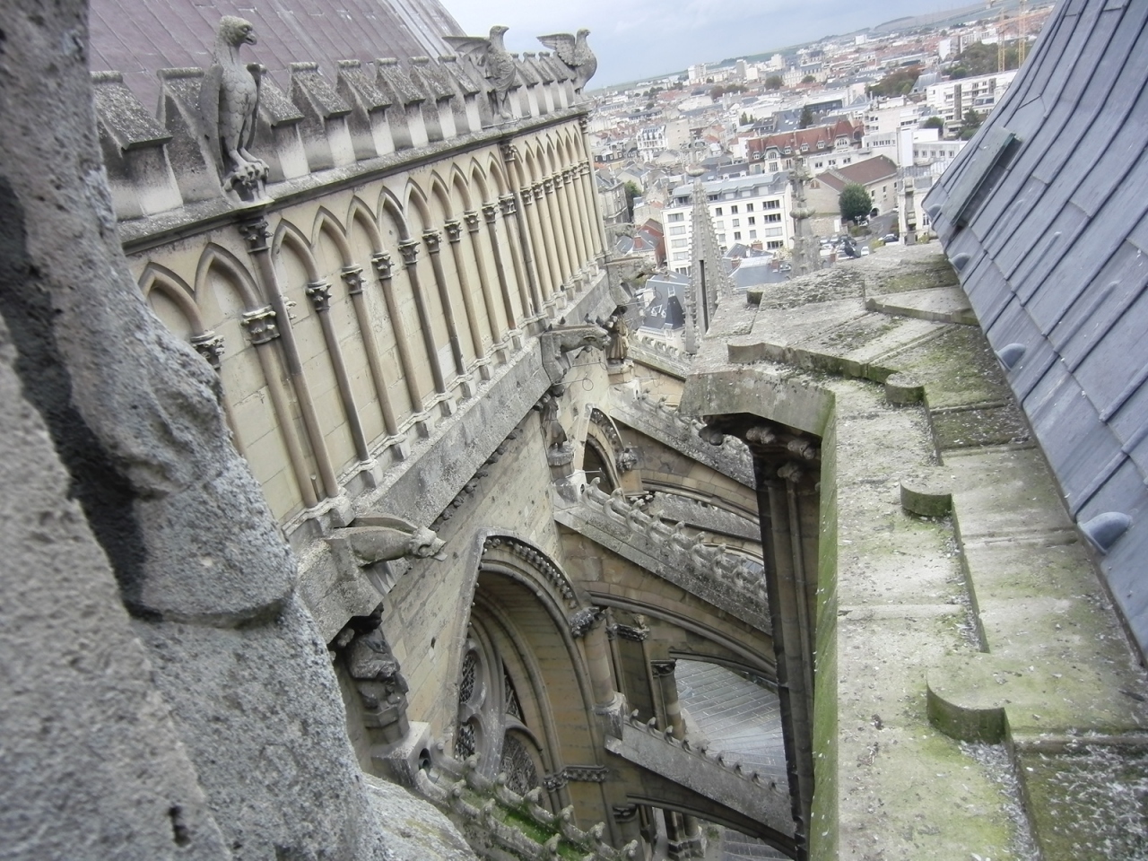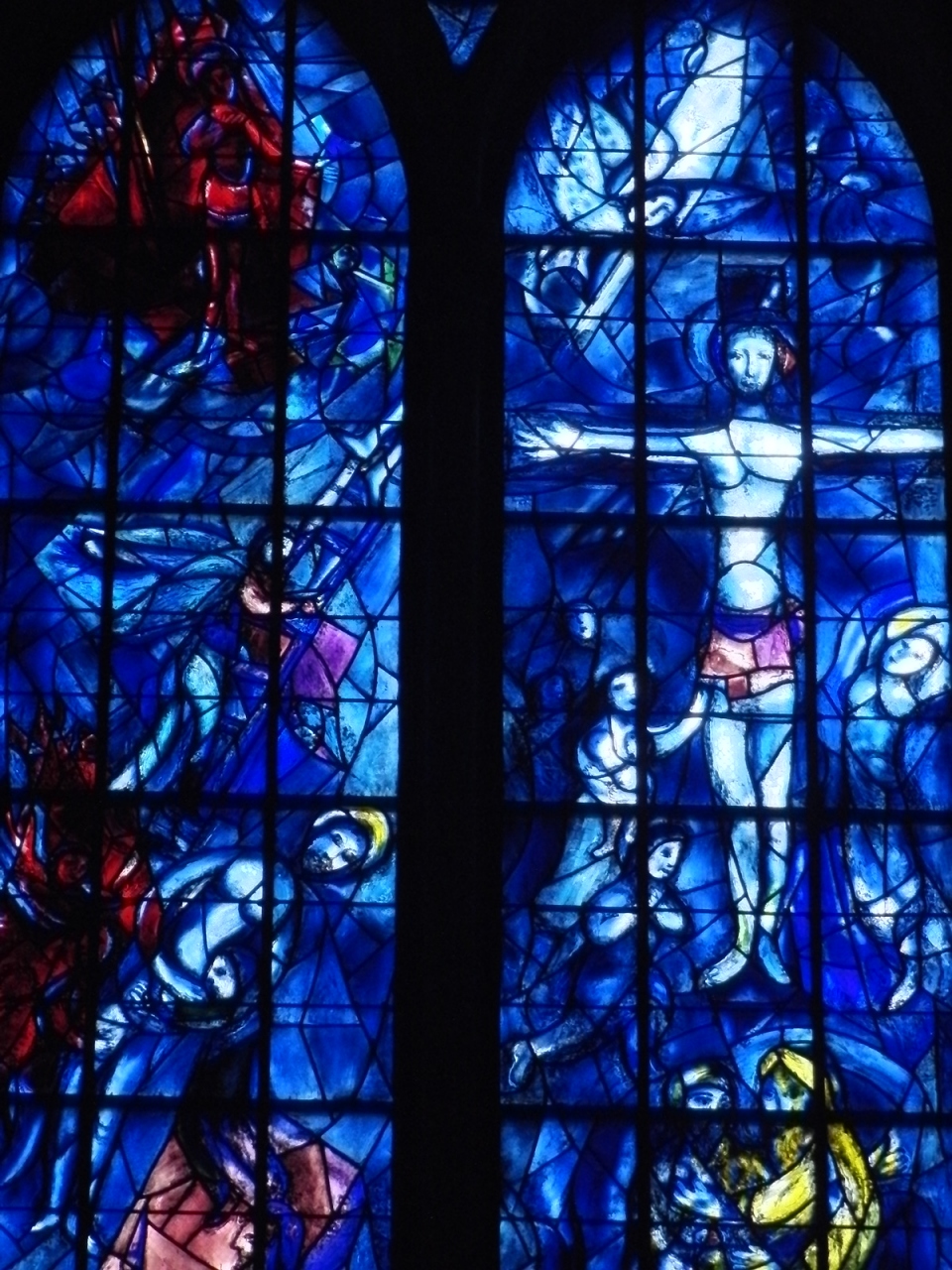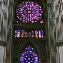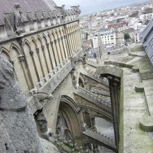 西正面のタンパン部分にステンドグラスがあり、その上の破風部分に彫刻があるのが特徴の一つです。微笑みの天使やシャガールのステンドグラスがあります。塔のツアーはト-宮殿観光の有無で料金が変わります。隣の建物の売店で買います。