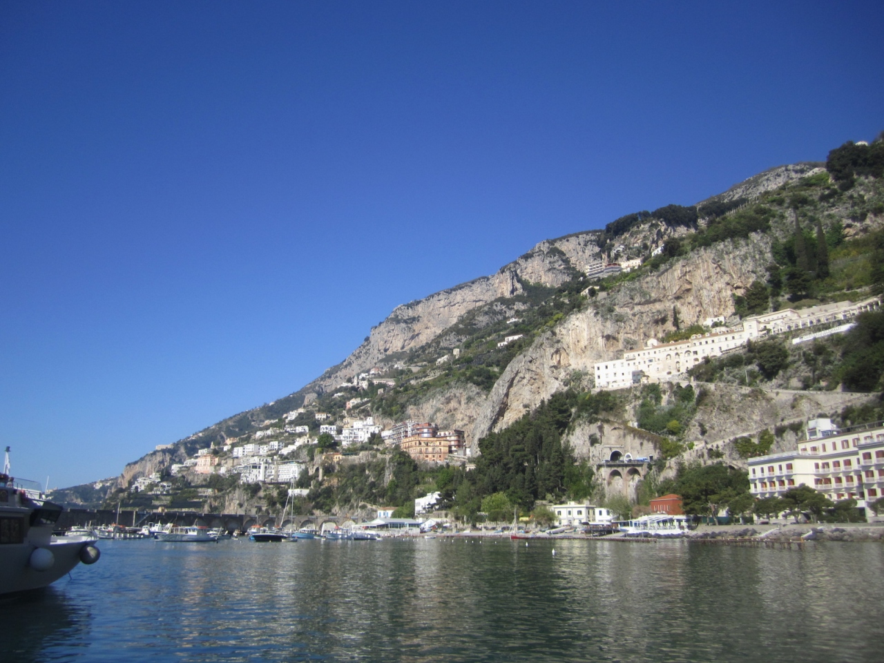 サレルノから高速船でアマルフィ海岸に行きました。船から見るアマルフィ海岸は、岩壁に家々が並んでいるのがよくわかりました。海もとてもきれいで、海の青、空の青、そこに家々のカラフルな色が映えて、とてもきれいでした。