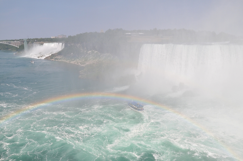 ナイアガラの滝はアメリカ、カナダの国境にあり、アメリカ側にあるのがアメリカ滝、カナダ側にあるのがカナダ滝です。カナダ滝の方が大きいですが、どちらも大変迫力があります。展望台やレインボーブリッジから眺めてもいいですが、やはり霧の乙女号に乗って近くから見るのがいいです。