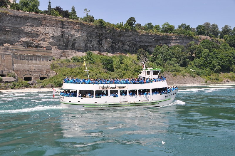 ナイアガラの滝の滝壺付近まで行く観光船で、アメリカ側とカナダ側から出ています。カナダ側の方が行列が長く、アメリカ側の方が空いているようです。水色の雨がっぱが配られますが、そんなものは役に立ちません。ずぶぬれになります。でも大迫力なのでおすすめですよ。一眼レフカメラもずぶぬれになるので、ビニール袋などの防水対策を忘れずに。