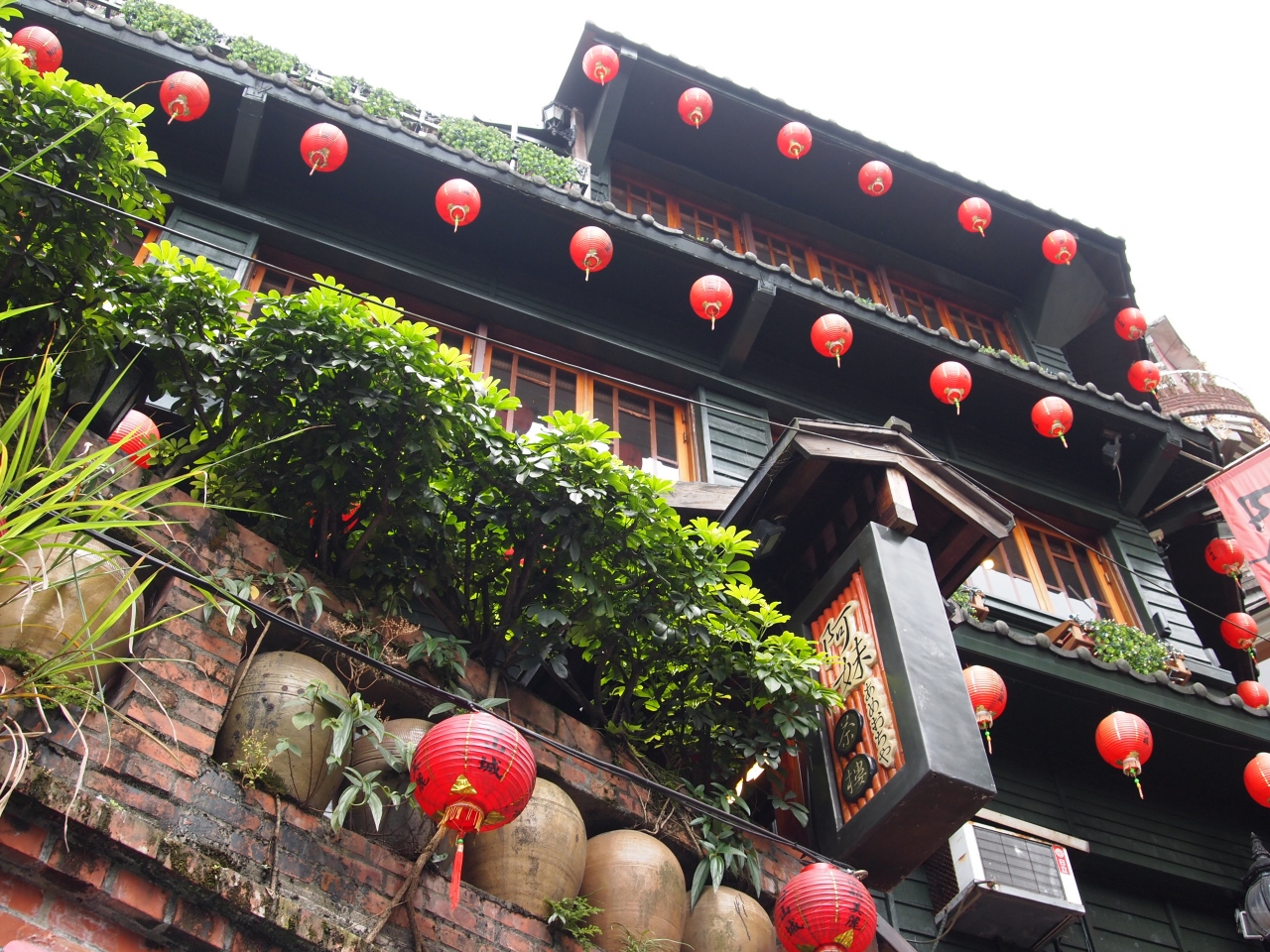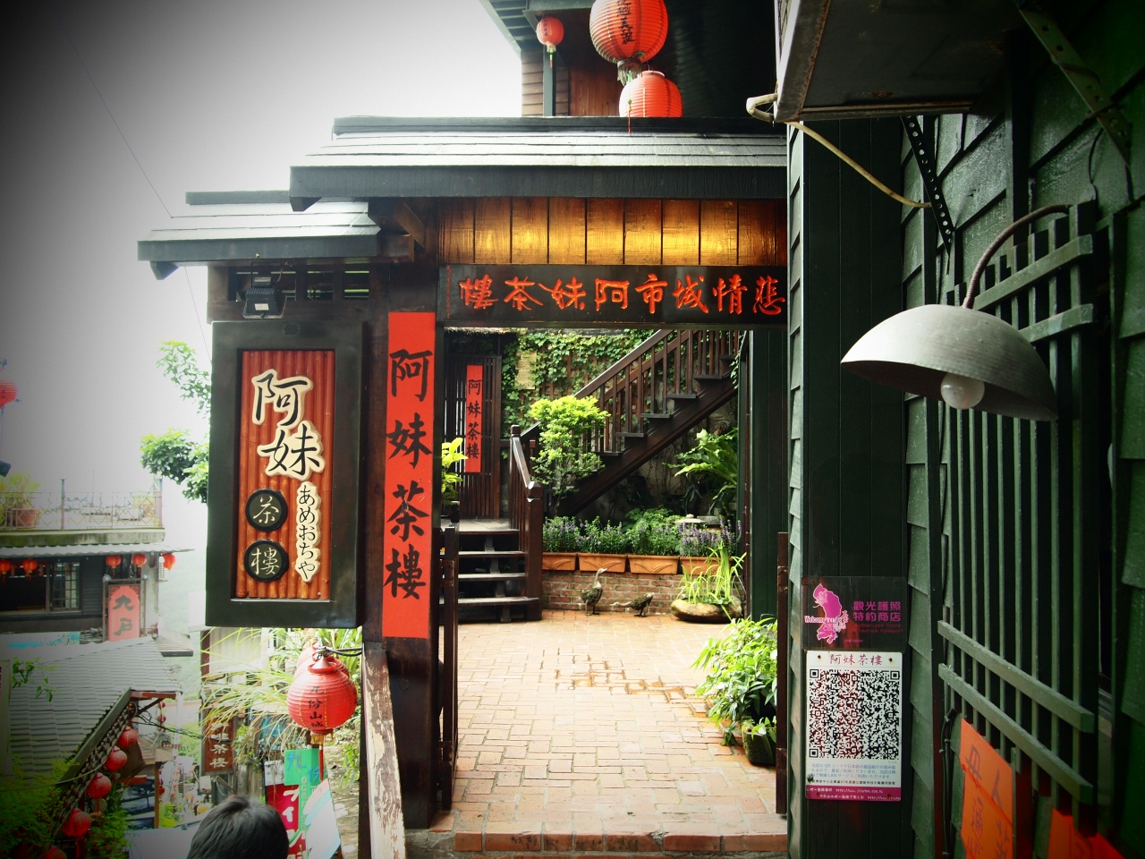 九分らしい光景を作り出している、階段の中腹に位置する赤ちょうちんの灯る阿妹茶館(あめおちゃ)。街歩きの途中に休憩しました。