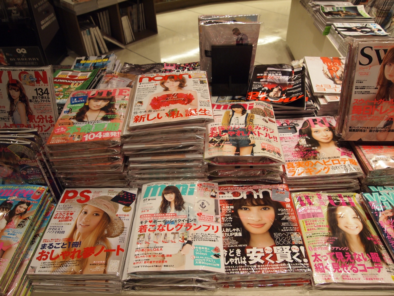 台湾の女性誌と同じかそれ以上くらいに、日本から輸入された雑誌がずらっと並んだ様子にびっくり。
