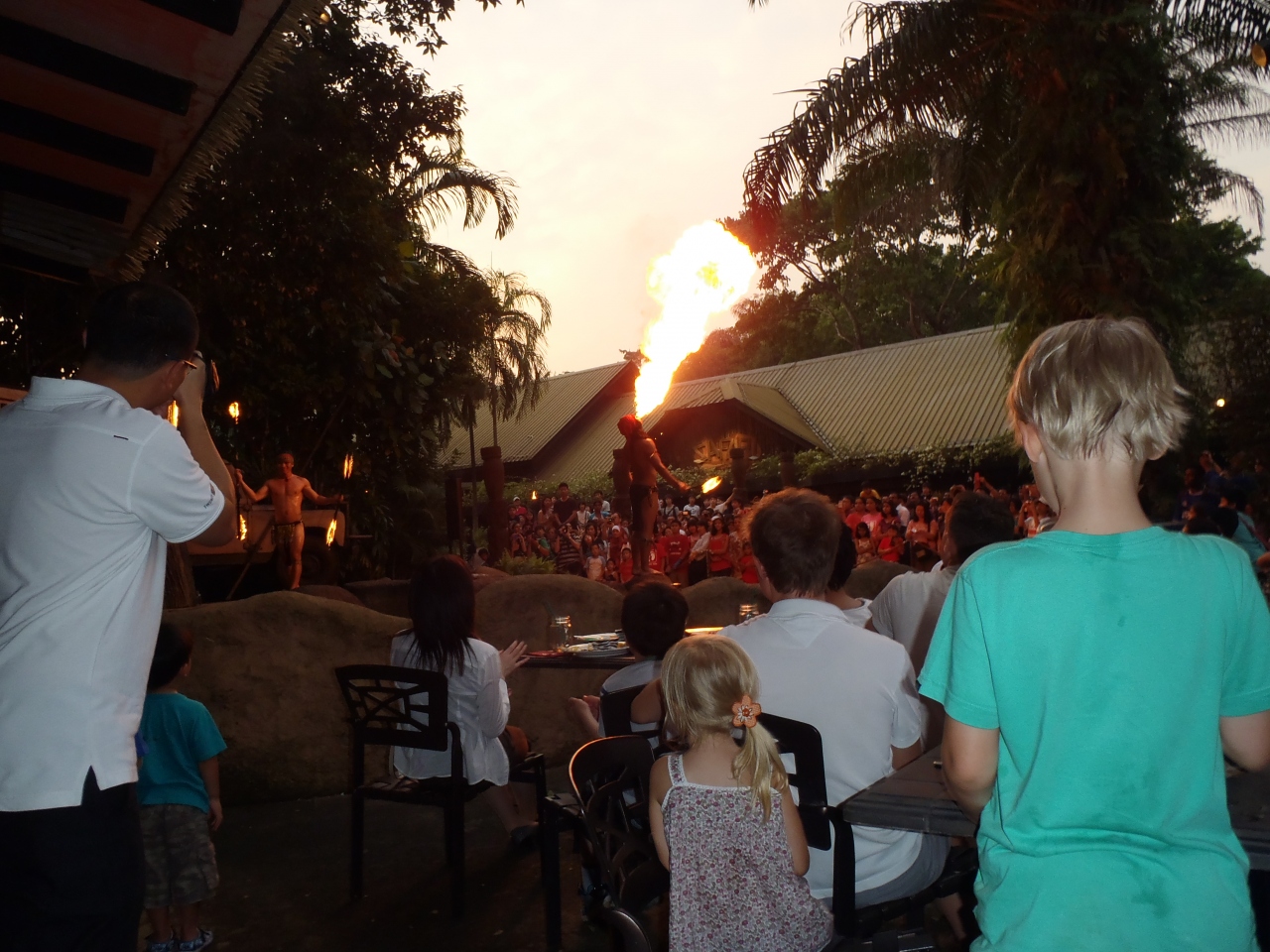 夕方早めに移動して、エントランスのレストランで食事をしました。席を選べれば、開園前のファイアーダンスがまじかに見ながら、食事がきます。園内は多少の起伏があるので徒歩では結構汗をかいてしまいますが、トラムでスーと通り過ぎることなくゆっくりと観察できます。