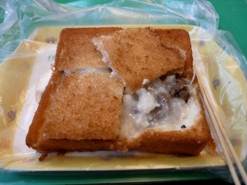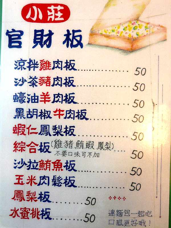 私のお薦めは44番の「小荘 官財板」です。官財板は厚手の食パンを揚げて、その中にシチューを詰めたものです。食パンを揚げずにトーストする店もありますが、私は揚げた方が美味しいと思います。確かに食べた後に油っこさは口に残りますが、官財板の蓋になるカリカリに揚げた食パンの表面が好きです。移転前は両方の方式の店がありました。移転して規模が縮小したと知って揚げる方の店が残っているか心配でしたが、この店は残っていてくれました。(^。^)