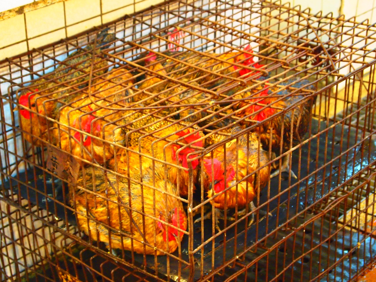 コッココッコとそこら中でニワトリの鳴き声が聞こえます。視線を落とすと檻に所狭しと詰め込まれた鶏。