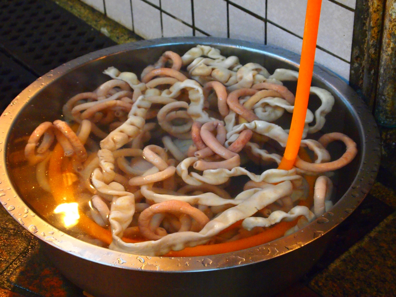 その檻のすぐ横の鍋で、お店の大将に手際よく熱湯に漬けられ粛々と屠られていました。