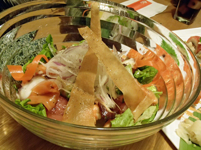 オーダーしたもの全てがおいしかったのだが、あえて誰もが楽しめそうなものを一つあげておくと「サシミ・サラダ」だろうか。いろんな刺身をサラダの具材として使うなんて贅沢で、家庭では出来そうで出来ない「作品」だ。量もあるし、皆で取り分けて食べるのにもちょうどいい。