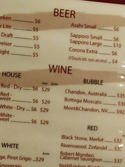 ちなみに日本酒は、銘酒として名高い「十四代(4オンスグラス=約110ミリ18ドル)」のほか「越の寒梅(9ドル)」や「亜麻猫(7ドル)」なんてお酒もあって、日本酒通も納得のラインナップ。ビールは5ドル(9枚目の画像参照)。