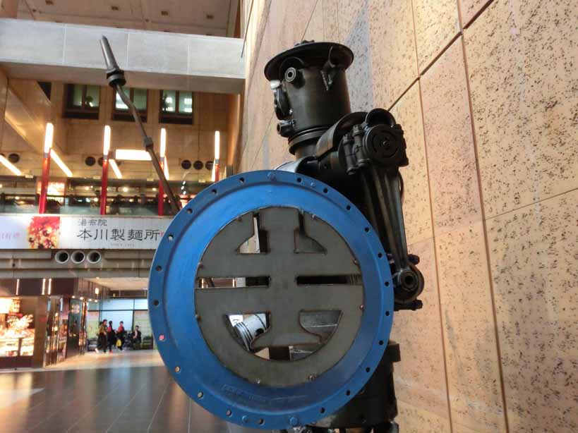 駅構内で、見つけた面白い物は、鉄道の廃材で出来たロボットみたいな人形。