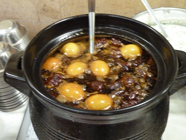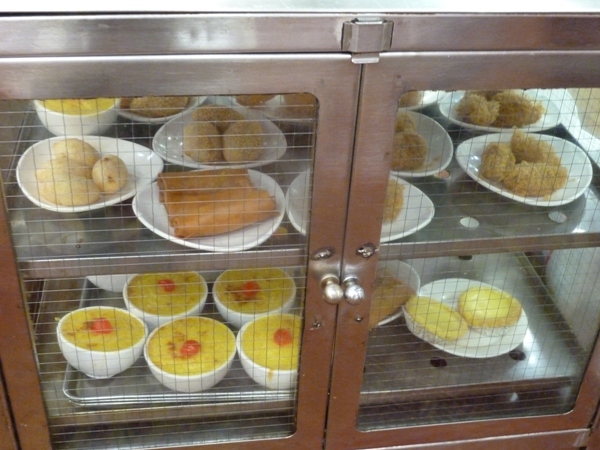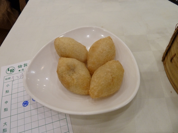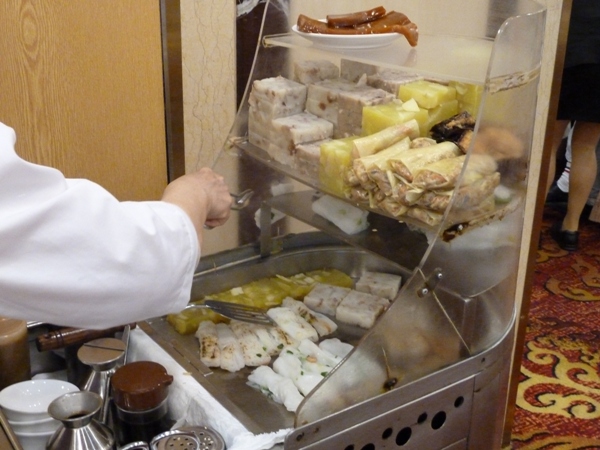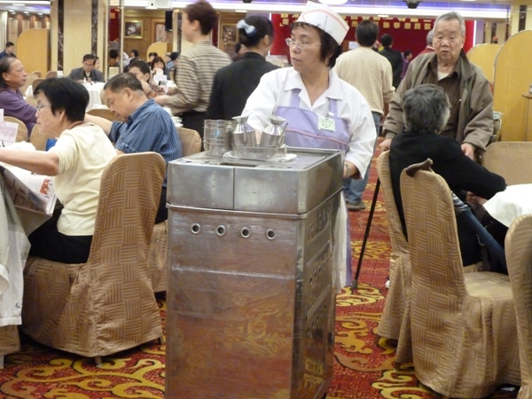 朝、早い時間に一人で行ってみましたがもう結構お客さんが入っており、入口付近でお店の人に「一人」と言うと勝手に空いてる席をさがせというようなことを言われました。奥の方へ歩いて行くと他の店員さんにここへ座れと言われ座る。店内はなつかしいワゴンが回ってきて、好きなものを選ぶとオーダーシートにハンコを押してくれ、最後に店員さんに手をあげて合図して、そのシートを渡して席で会計するシステムらしい。前の方にはスープとか焼きものとかワゴンで回ってこないものを直接自分で取りに行く場所もあるのでここも忘れないように。値段はおしゃれで近代的な飲茶屋さんよりずっと安かった。