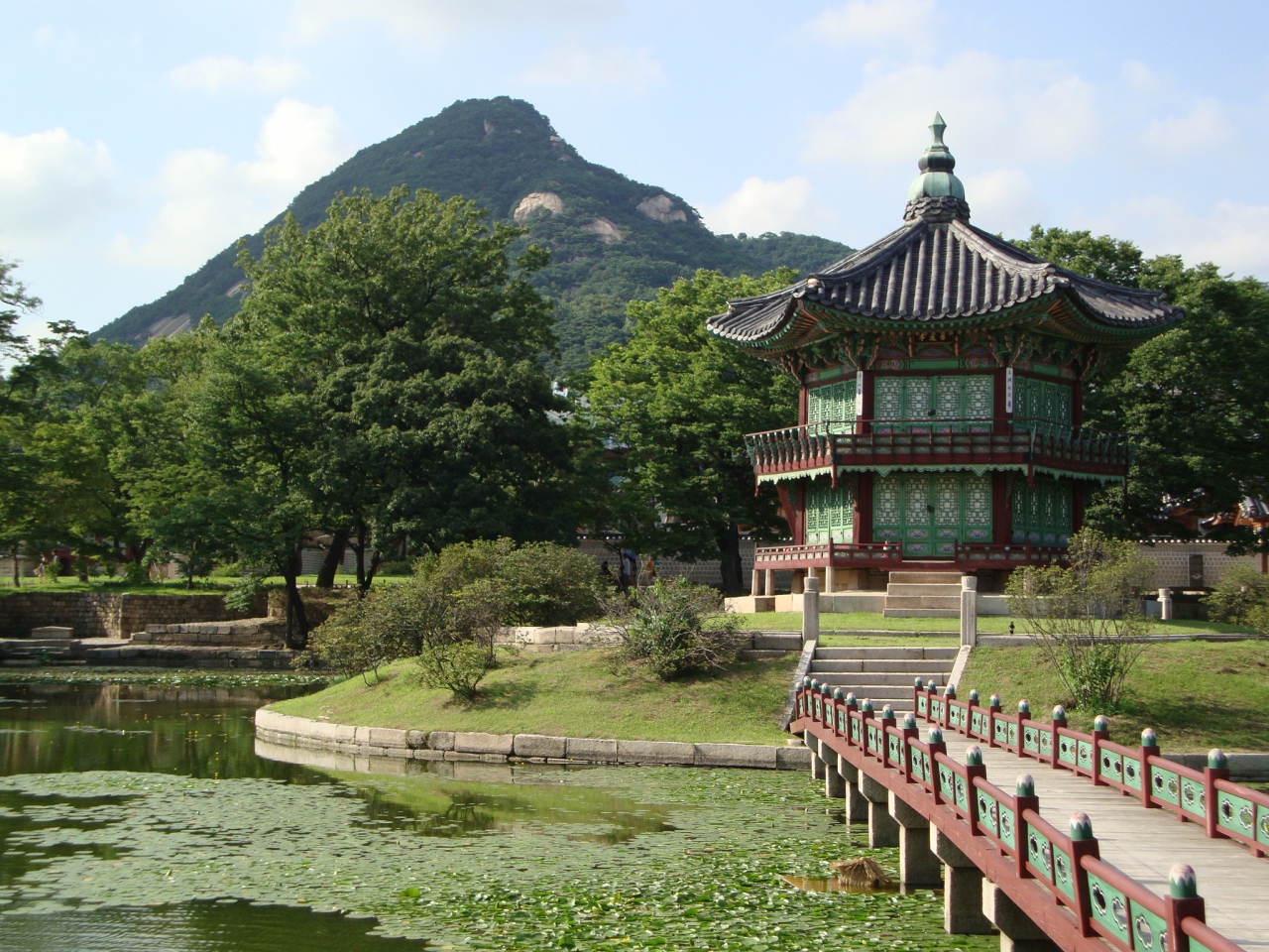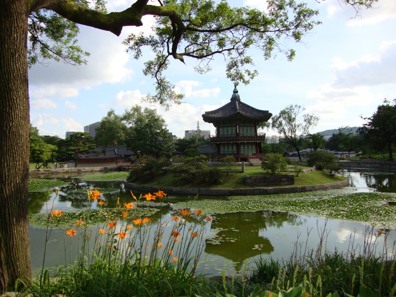 景福宮の北側(奥)にある香遠亭。第26代王・高宗が乾清宮を立てる際、南側に池を掘りその中央に建てた八角形の東屋。「蓮の花の香りが遠くまで届く」がこの名前の由来。蓮の花の時期ではなかったけれど、湖畔にキスゲの花が咲き緑に囲まれた静かな場所で、景福宮を代表する美しい場所の一つだと思いました。湖畔にベンチが設けられのんびりできます。