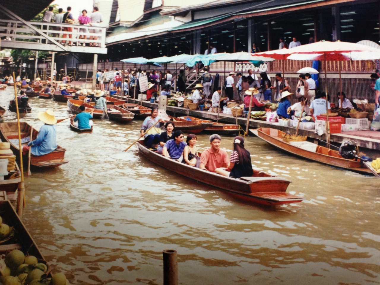 バンコクの水上マーケットの商売は小船に乗ったまま行なわれることが目玉で、一目見ようと集まる観光客で賑わっていました。マーケットは早朝が一番多忙で、朝9時くらいがピークなので、ねらっていくと良いと思います。