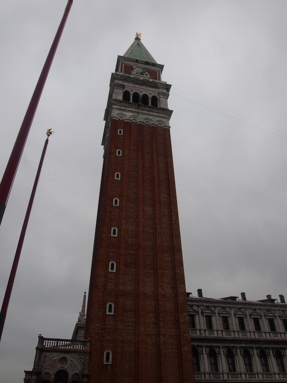 サンマルコ広場にあります。まわりが落ち着いた灰色の建物だったのに比べて、鐘楼だけは赤いレンガ色でとても目立って見えました。きれいないろをしていました。存在感がありよかったです。大きすぎで写真に収めきれませんでした。