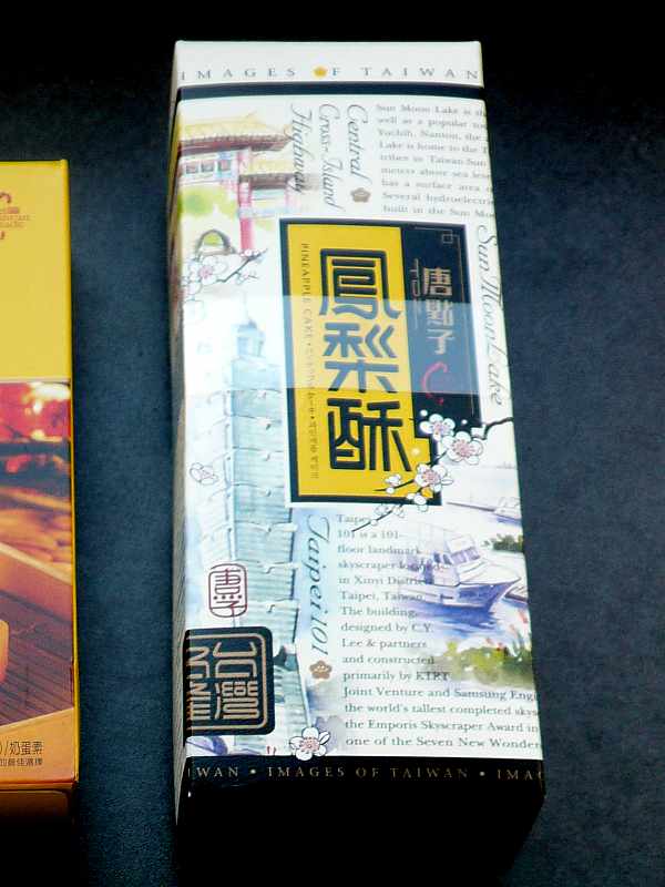 上級品は12個300元以上の商品で「鳳梨"酉禾"」の横に「唐點子」というブランド?が書いてあります。私が買ったのは5個入が170元の箱ですが、その時の店員は12個入350元の箱と中身は同じ物だと言っていました。個別包装で各包装の中に品質保持剤(酸素吸収剤?)の小袋が入っています。賞味期限は1月25日時点で3月3日でした。パイナップル・ケーキは中級品(25g)より一回り大きく(45g)、ケーキの生地はしっとり感があって老舗の商品に匹敵する味わいだと思います。