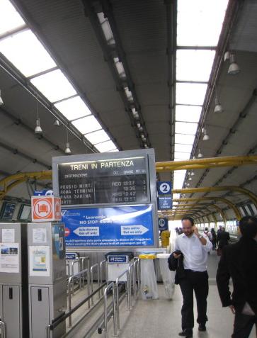 ローマの空港と連絡路で結ばれているのが、空港駅です。ここから電車でローマ市内へ行けます。空港からのアクセス方法は到着ロビーから出発ロビーに上がり、T3方向へ。