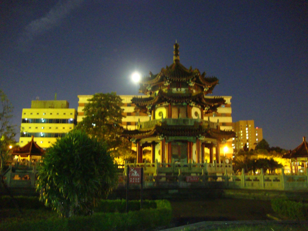 訪問した日は台風一過で天候に恵まれた一日、ちょうど‘中秋の名月’。公園内の中国風東屋がライトアップされ、池にその姿が映し出されていました。そして東の空に白い丸い月が輝き‥とても綺麗。風情を感じる光景でした。