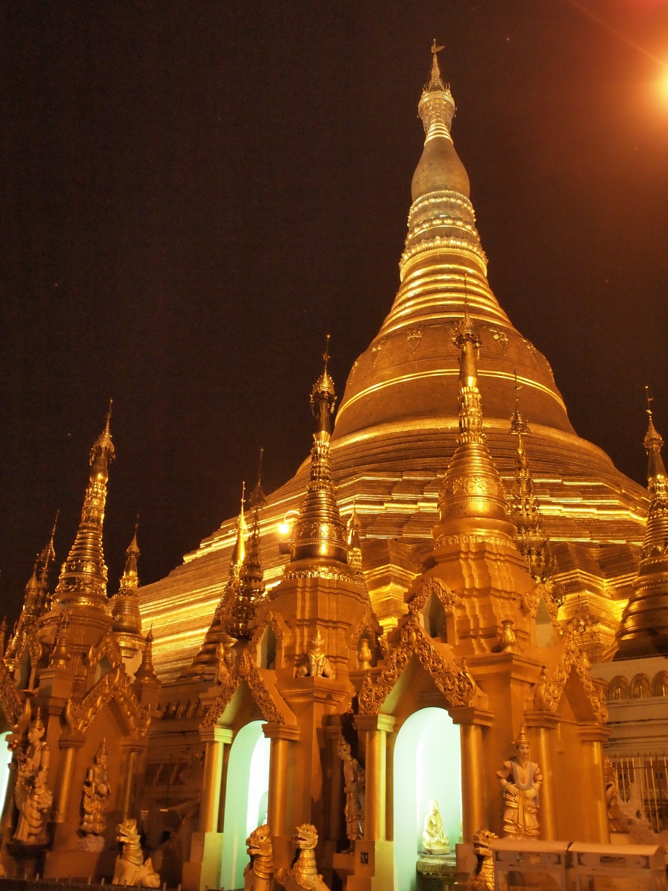 ちなみに、お寺の数箇所のポイントからパゴダのてっぺんをみると、場所によって様々な色の宝石が光り輝いたように見えます。何人かの人が同じ場所から上の方を見上げていたらそこの場所かもしれません。