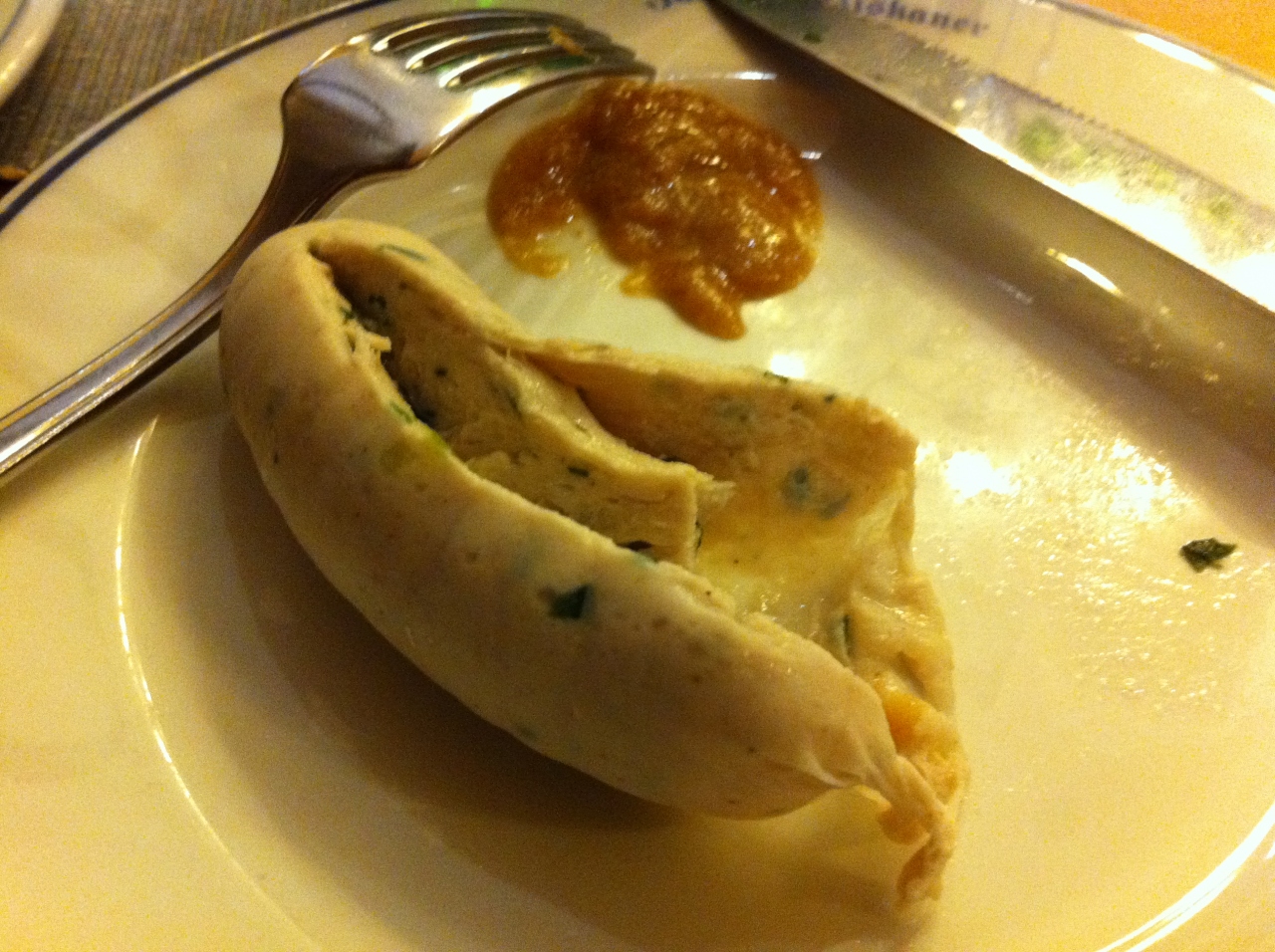 客層も内装もエレガントなお店です。白ソーセージは2本入り6ユーロ。繊細な味で美味しかったです。そしてミニボトル入り白ワイン8ユーロ。カゴに盛られたパンとプレッツェルはサービスかと思ったらキッチリ4.2ユーロ。しかし他のお店のものに比べて美味しいんですよね。