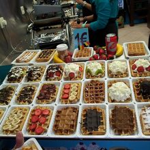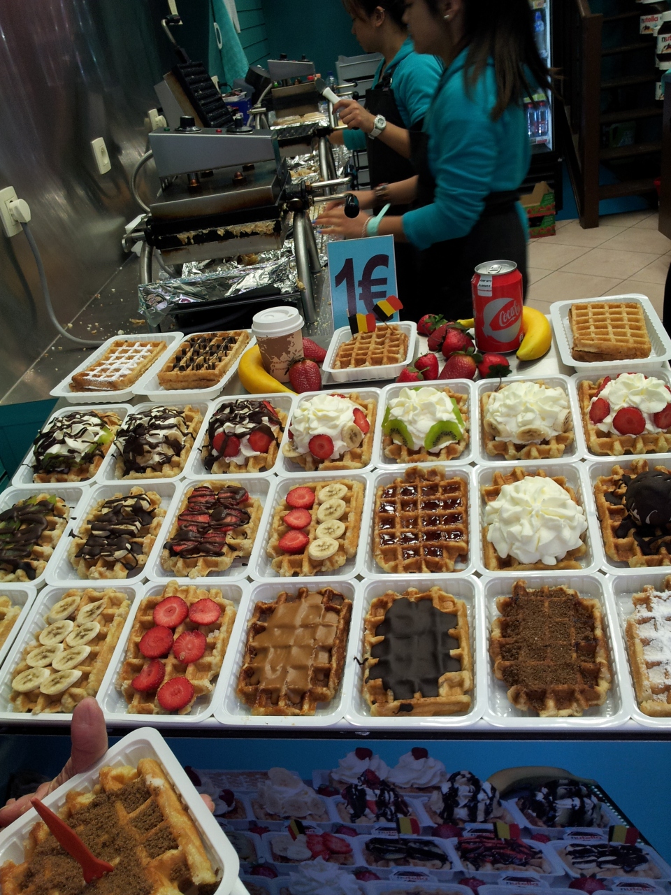小腹が空いたので、「ワッフルの食べ比べをしてみよう」ということになり、ダンドワで二人でワッフル一枚を購入して食べた後、ゴーフルブリュッセルへ行き、また一枚購入、その後、ホテルへ戻る途中、小便小僧の近くのショップでまた一枚購入、我ながら良く食べるなと思ってしまいましたが、此の最後のお店が二人の中で第一位となりました。店名は忘れてしまいましたが、小便小僧に向かいすぐ左手にありました。お値段は3店舗中最も安くトッピング込み2ユーロでした。