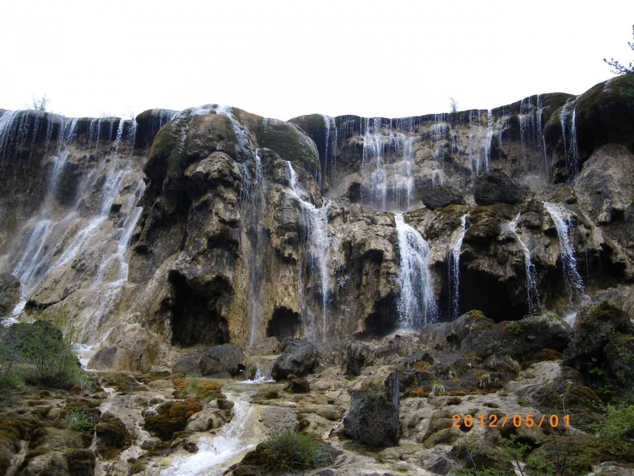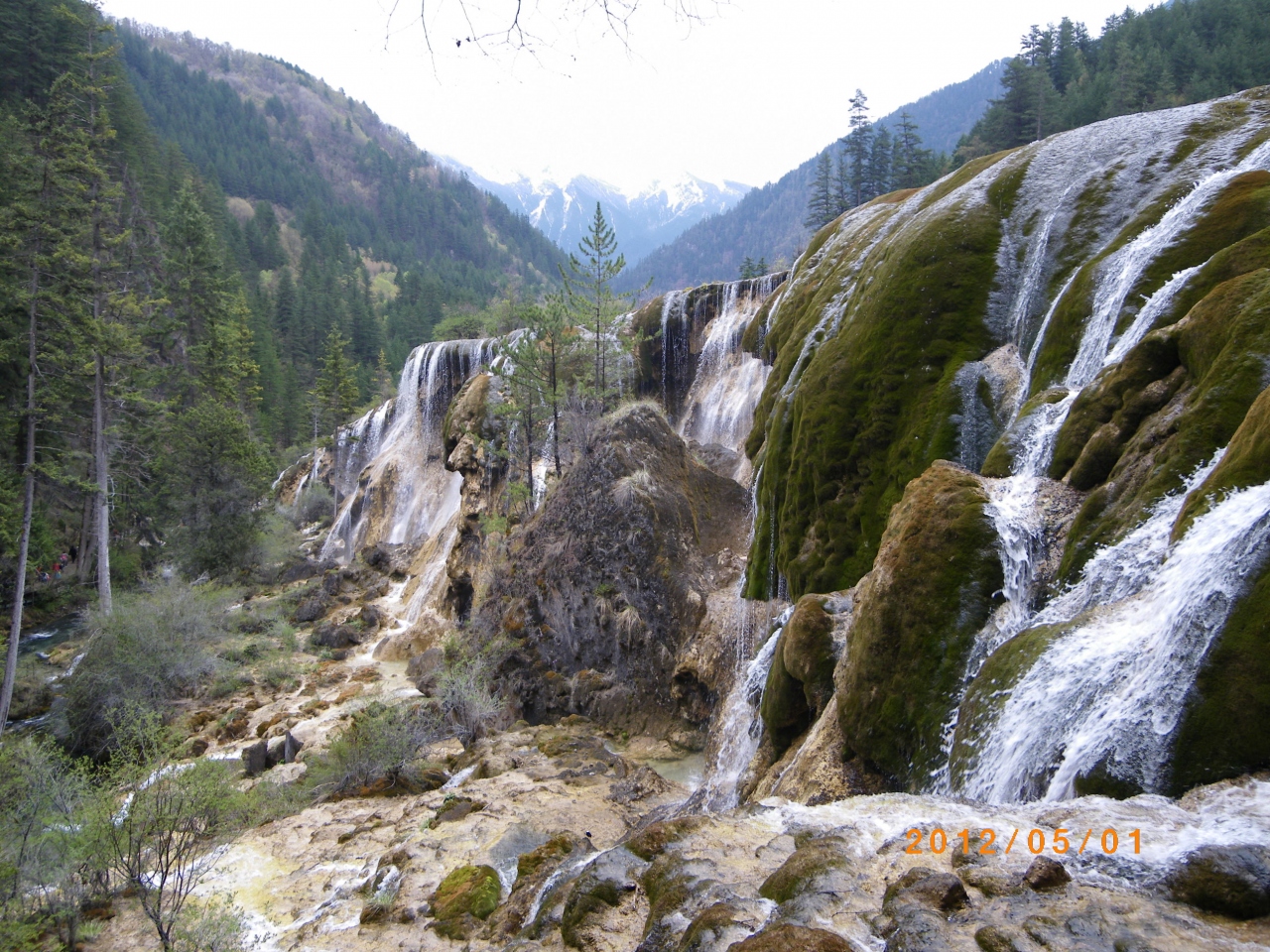 海抜2433m地点にある幅310mの滝。九寨溝で最も迫力のある滝と言われているらしいが、私たちが訪れた5月初めは水量が少なく残念。しかし少ないながらも幅があるので、流れ落ちる姿はとても見応えがあった。