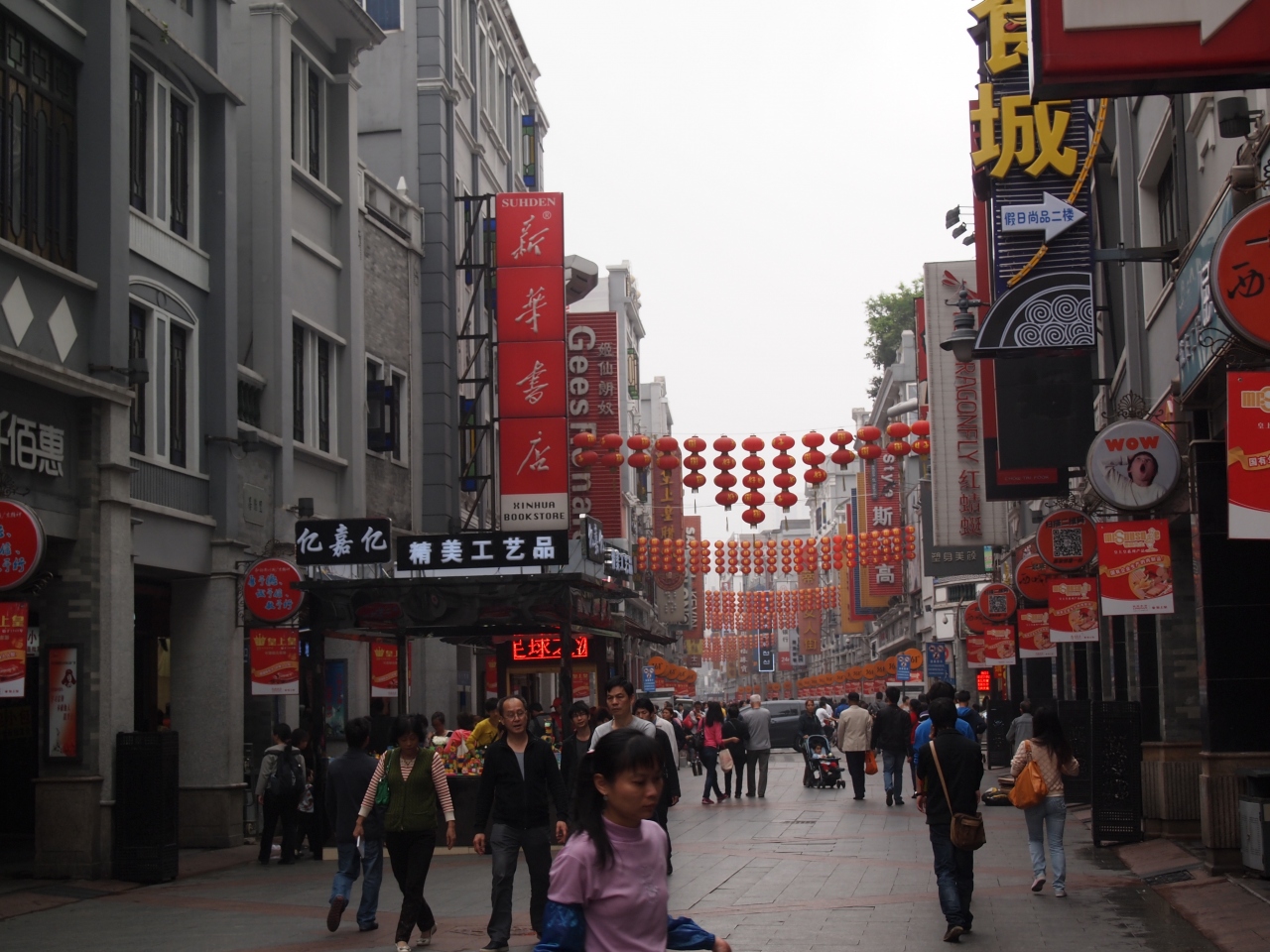 広い道の両側に、洋品店、飲茶、食堂があります。丁度、春節の後だったので、道には飾りが飾られ、華やいだ雰囲気でした。 歩行者は、道路の真ん中を歩いていますが、歩行街と言う名前とは裏腹に、車も通る(突っ込んでくる)ので、注意が必要です。