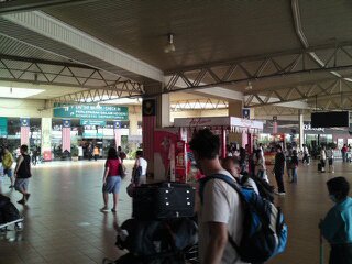 イミグレ抜けて屋外へ出ると左手にマクドナルドがあり、そのマクドナルドをL字を右に曲がり直進するとバス乗り場があります。