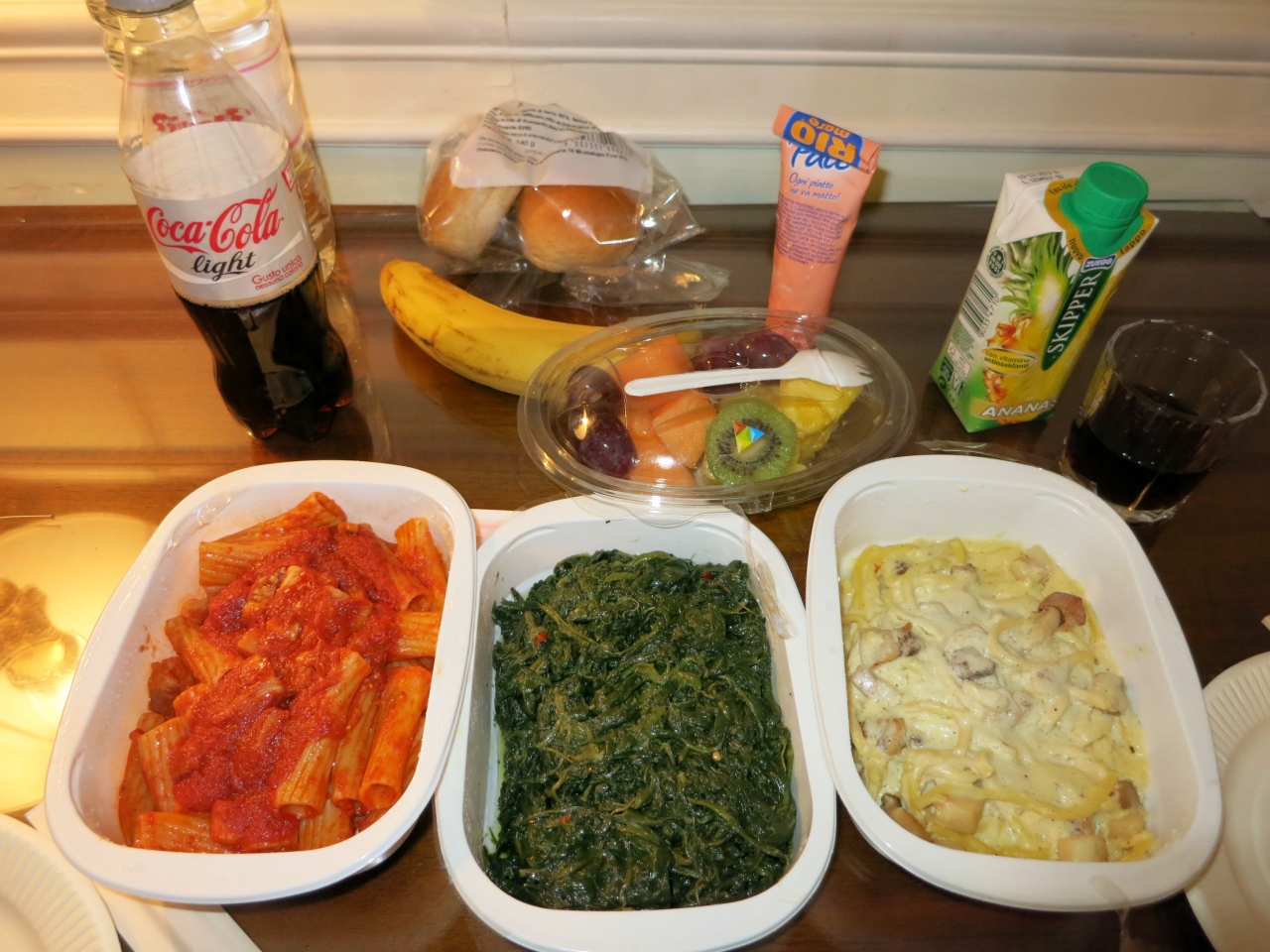 入ってすぐ左手にある冷蔵庫に並ぶパック入りのお惣菜たち。カルボナーラやアマトリチャーナ、ラザニア、ほうれん草のソテーや温野菜サラダなどなどは、レジで支払った後に担当の方に言えばレンジでチンしてくれます。スーパーですから、飲み物もパンもサラダもフルーツもありますし、もちろん、熱々の切り売りピザもあります。ですから、好きなものを食べたいだけ買えば無駄のないディナーテーブルの完成となるわけです。心配なお味の方も、十分イケてます。カルボナーラは2回も買ったほど!お値段も安心のスーパー価格。使い捨てのナイフとフォークも15セントで付けてくれます。駅から歩いて10分弱のホテルでしたので、熱々のお惣菜をお部屋でのんびり食べることができました。