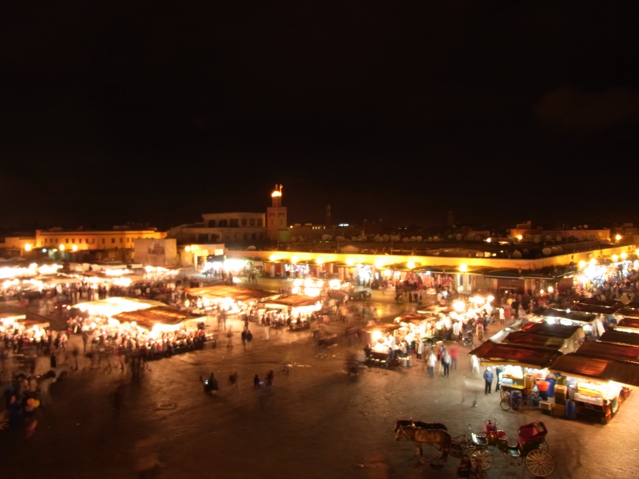 マラケシュ滞在の拠点です。ホテルもフナ広場の近くであれば間違いなく便利です。広場からはスークが広がり買い物もできる。広場に面しているカフェでは観光客向けですが安心して食事できます。夜、カフェの屋上から見下ろすフナ広場はきれいです!あと、屋台のオレンジジュースは最高!