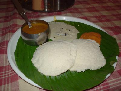 - 南インド特有なバナナの葉っぱを引いたカレー料理でどこでも辛い。ここで米蒸かしパン:イドリーを食べた。それは中々美味しかった。