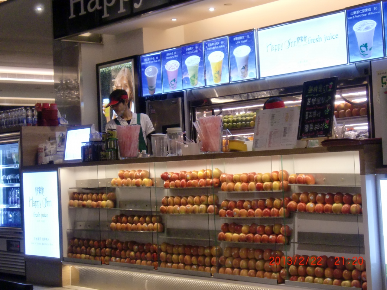 平日の夕方に行ったため、ブランド街にはお客がほとんど居なく、定員の姿ばかり目立っていました。ブランドショッピングに興味はないので、地下のフードコートと隣接するお茶の販売店に行きました。なにせ広いのでお目当てのお茶店を探すのに、相当歩いてしまいました。フードコートは夕食時だったので、7割ほどテーブル席も埋まっていて結構な人ごみでした。フルーツジュースのお店で購入したジュースが美味しかったです。内容が分からないまま看板を指さして注文(80元)しましたが、ヤクルトのようなものを2本と何かフルーツ等を入れてミキサーにかけてくれます。