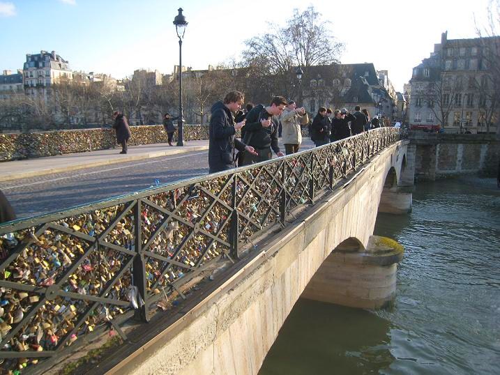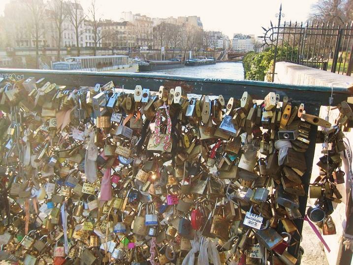 シテ島からサン・ルイ島に向かって歩いていると、カラフルに見える橋がありました。ノートルダム大聖堂正面を右に進み、しばらく歩き右側に橋が見えます。近くに寄ると南京錠がたくさん取り付けられていて、その数半端ないです。