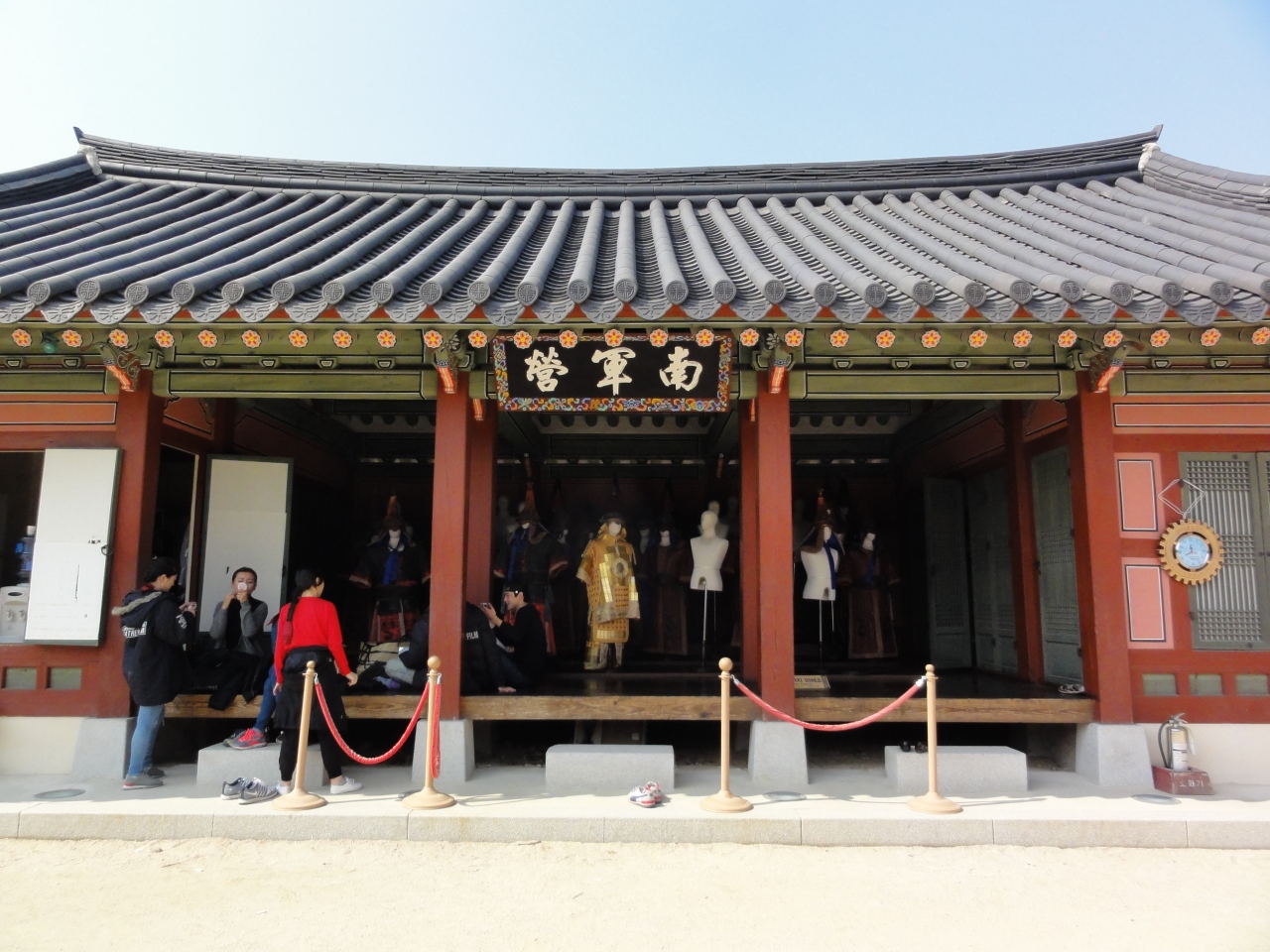 華城行宮入口・新豊楼の左右にある宿衛所。王を護衛する精鋭部隊・壮勇営の騎馬兵だった親軍衛が、‘南軍営’‘北軍営’それぞれ100人ずつ入直・宿衛していました。南側(門の左)にあるのが‘南軍営’。色々な武官の衣装をきた人形が展示されていました。