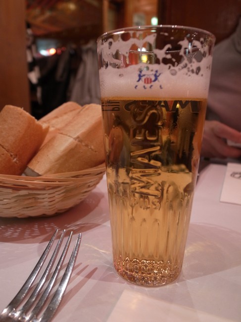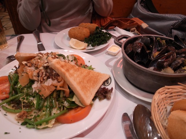 料理は量が多そうだったので、2人で、スモークサーモンサラダ・ムール貝の小さめのココットとフリッツ、ビールがセットになったもの・コロッケ、それからビールを別に頼みましたが、パンはついてくるのでこれだけでもう満腹!と言った感じでした。