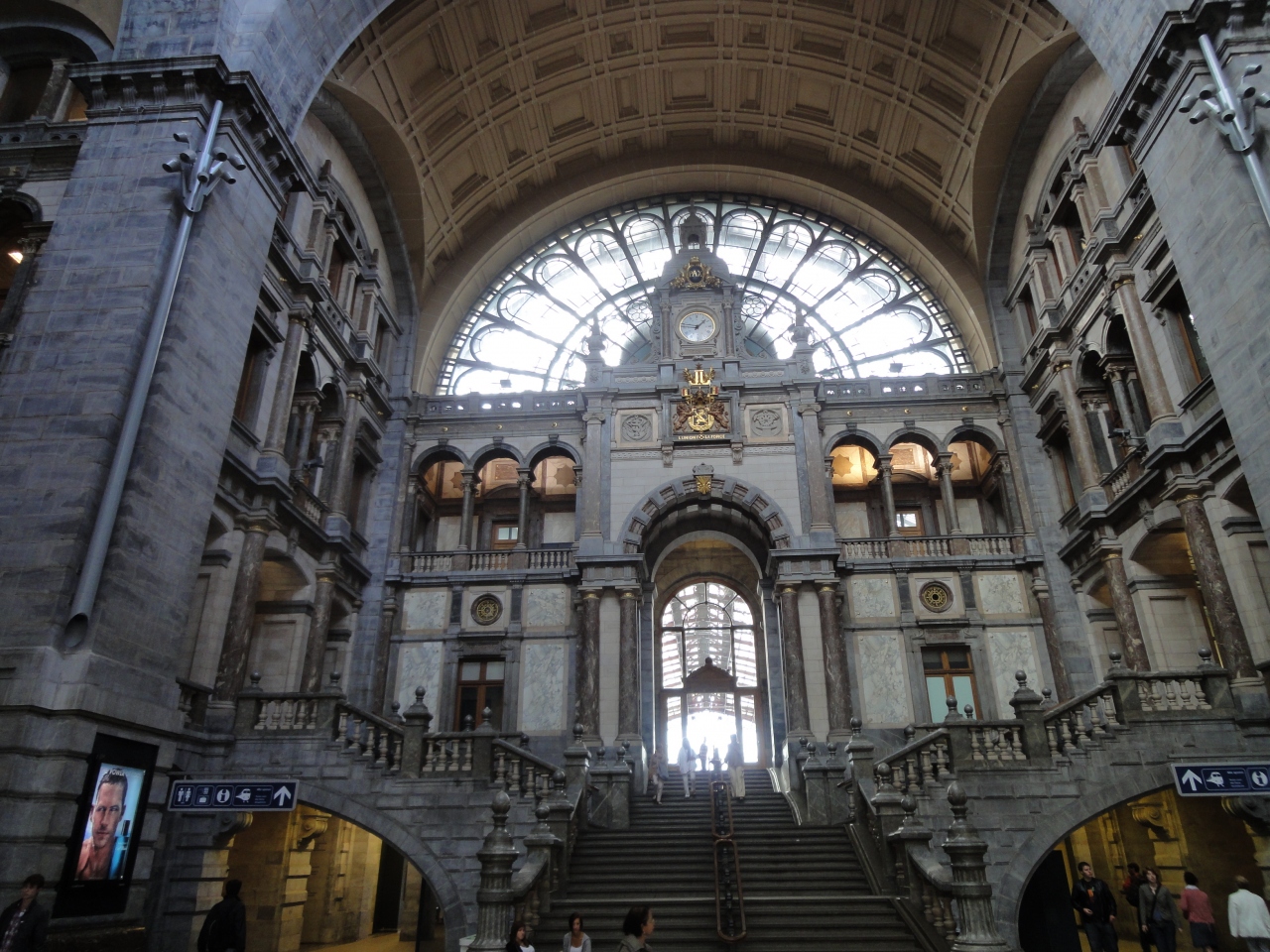 ブリュッセルから約50km、ICで40分で到着。TVで見た通り、この駅舎は荘厳で凄い。ここは、19世紀から20世紀の変わり目に建造されたネオバロック様式の駅舎。ガラスと鉄骨で築かれた半円筒形のホーム天蓋は傑作だ。アントワープ市街地の散策の前に、雰囲気あふれる素敵なカフェで想いをはせた。