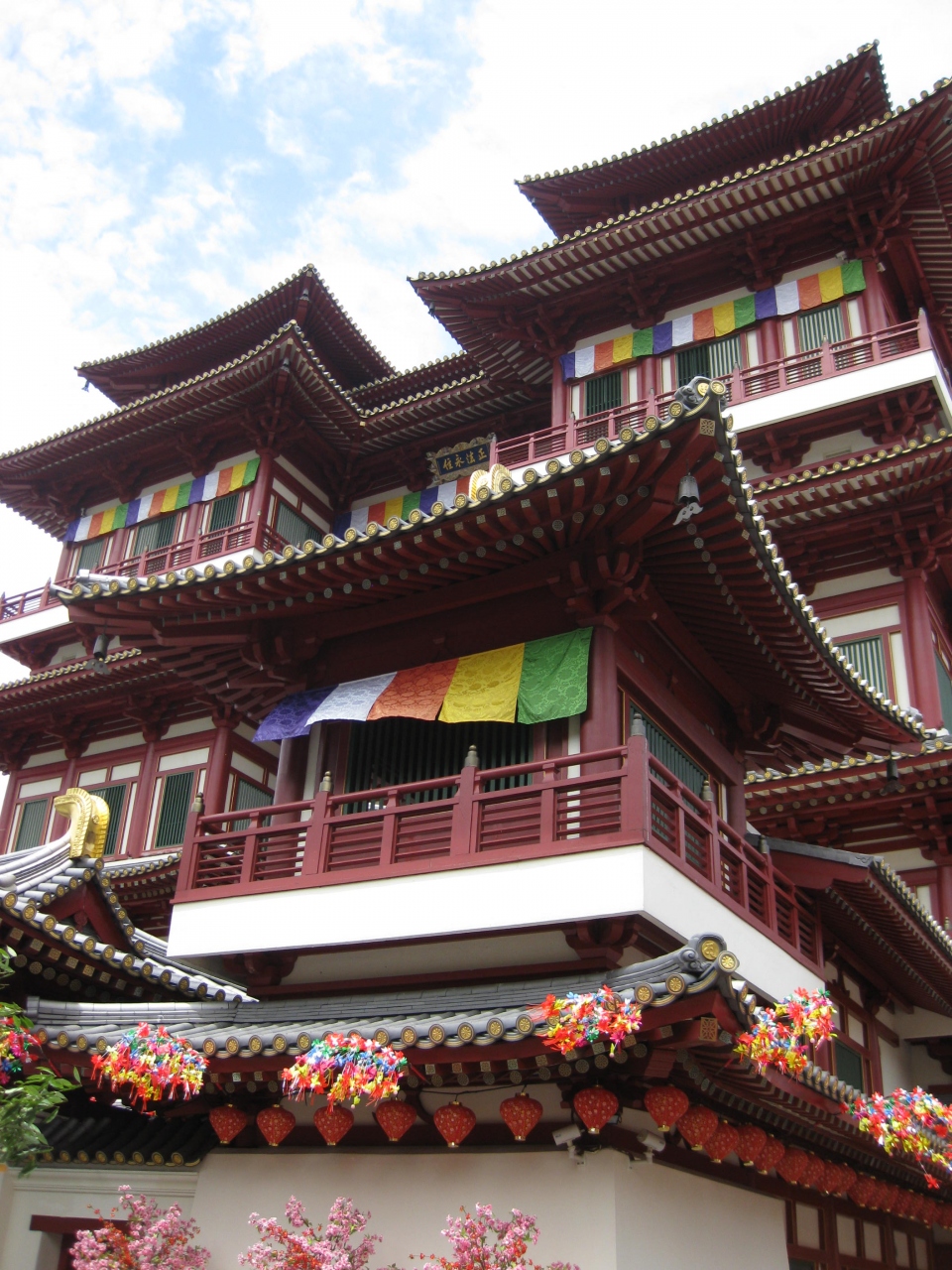 外観は朱色が鮮やかで、特徴的な形のとても目立つ寺院です。