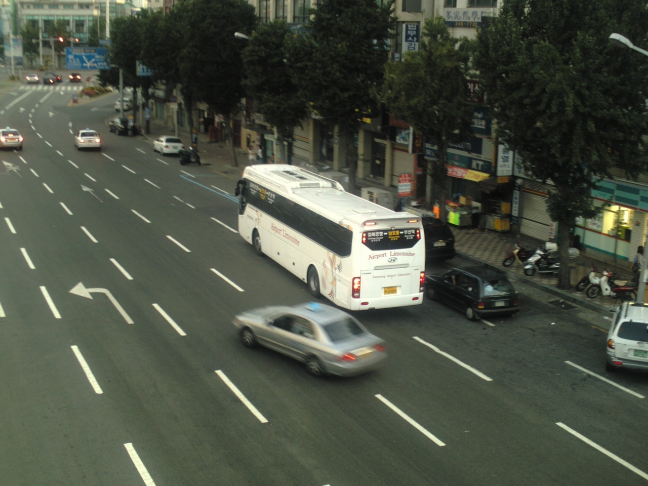 当時は金海空港と市内間を結ぶ鉄道が無かったので、タクシーかバスを利用していました。バスは車両前面に行き先が表示されているため分かりやすかったです。写真は宿泊したフェニックスホテルの窓から撮った写真です。ホテルの目の前に空港バスのバス停があります。