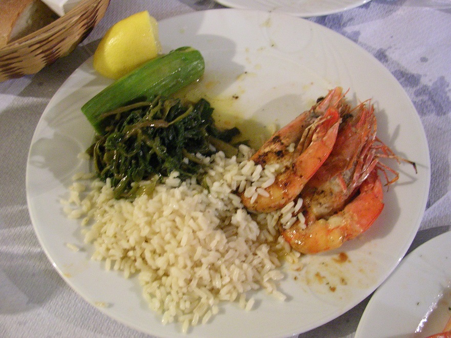 プラカ地区で最も人通りの多いキダシネオン通りに面したレストラン。世界遺産のど真ん中であるため、夜はとても多くの人で賑わっています。魚介がオススメということで、海老をオーダー。カリッと香ばしく焼かれていて、ビールとピッタリでした。
