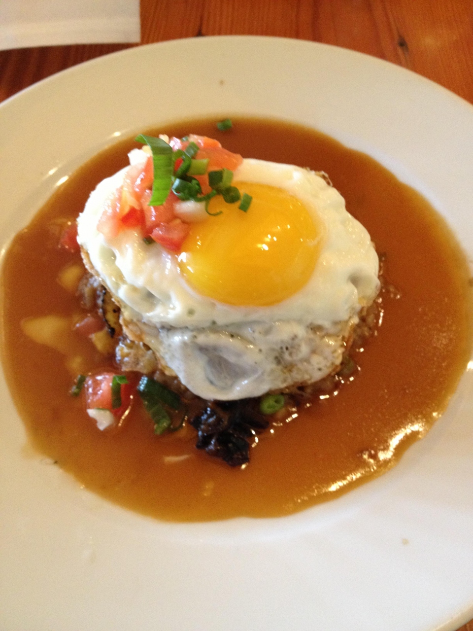 ロコモコは上品な子牛の肉汁のソースがよくあるロコモコのグレービーとは違う感じ。